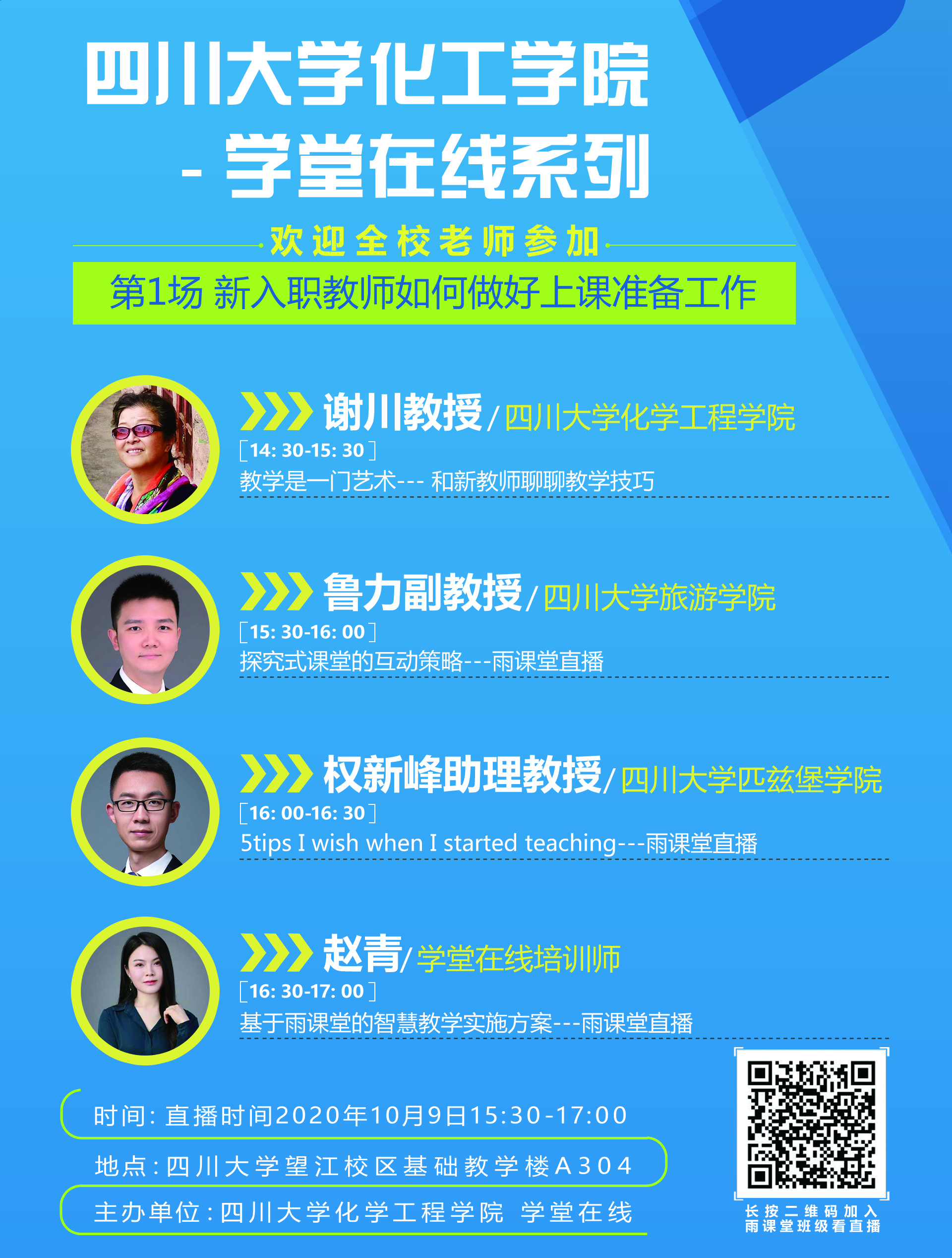 AV研究所 -学堂在线系列教发活动第1场将于2020年10月9日14:30于望江基教楼A304举行(线上直播为15:30,链接请见海报),主题为新入职教师如何做好上课准备工作,包括教学技巧,互动策略、准备建议和信息化教学工具使用,诚邀全校老师参加。