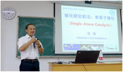 张涛院士从国民经济的实际需求入手,介绍了航天航空飞行器所需要高效的催化剂必须具备低温启动性和高温稳定性。接着,张涛院士从航天航空催化剂载体的设计和制备入手,介绍了近年来他们在通过调整催化剂载体孔结构并设计了有序介孔复合载体,制备高效航天航空催化剂的研究工作。然后,张涛院士介绍了活性金属粒子尺寸的可控制备策略及其对催化活性的影响:从纳米到单原子尺度金属催化剂,张涛院士介绍了利用金属与金属之间的相互作用以及金属与载体之间的相互作用,并以Ag辅助分散的Au原子簇催化剂和载体上的羟基与Au的相互作用的研究工作,以及介绍了单原子Pt催化剂的制备方法及其高效特性,并以原子尺度高分辨显微技术、原位动态光谱表征技术和计算化学模拟等佐证了催化剂的单原子分散性。最后,张院士对催化剂在航天航空等领域的应用及展望作了阐述。张涛院士深厚的学术功底、宽广的学术思维、严谨的科研方法、对科学问题的透彻阐释以及幽默的语言,让在场的老师和同学享受了一场精彩的学术盛宴。