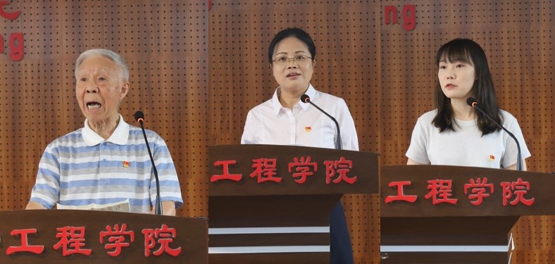 中共中央“光荣在党50年纪念章”获得者、学院老领导、64年党龄的梁明征同志带领大家一起回顾了曾经的入党初心,并表示会继续发挥余热为学院做出新的贡献;优秀共产党员代表、青年教师赖雪飞同志从坚定理想信念、牢记立德树人使命和投身教学改革实践等方面表示要以“四有”好教师为标准,争做教育教学的学习者、创造者、引导者;优秀党务工作者代表、研究生过程装备与安全科学党支部书记武雯颖同志结合“全国百个研究生样板党支部”的创建过程,表示要着力将学生支部建设成为有特色、有品牌、有辐射的党组织,加强思想政治引领,筑牢学生理想信念根基,引导学生刻苦学习、全面发展、健康成长。