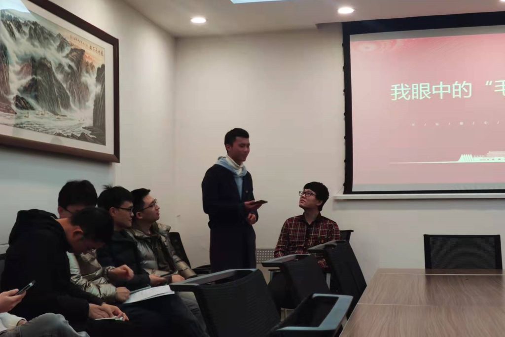 会议开始之前,由本支部纪检委员岑美琪同志核定并报道实到党员人数,会议应到正式党员21名、预备党员2名,实到正式党员19名、预备党员1名。在庄严的国际歌奏响后,活动正式开始。为了促进本支部新成员的快速融入、增强支部成员团结,本次活动采用“初心传递”进行暖场。在本次活动浓厚的氛围下,罗杰、邓磊两位同志主动请缨,背诵《沁园春·雪》和《沁园春·长沙》两首诗表达对毛泽东同志的缅怀。随后,本次活动进入毛泽东同志的故事分享会。各位同学踊跃分享青年时期毛泽东同志与马克思主义的故事。在邓松同志的带领下,支部成员们对“我眼中的毛泽东思想”这一中心发表了自己的理解与看法,同时对近期的多项时政热点进行了梳理与学习。