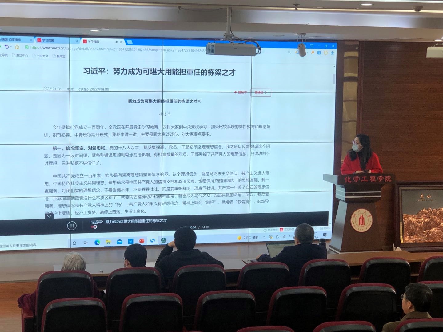 谢锐同志首先传达了学校“双代会”暨2022年度工作布置会的重点内容,简要梳理了本期学习的主要内容,并领学了本次政治学习内容。重点集体学习了习近平总书记发表在《求是》杂志上的重要文章《努力成为可堪大用能担重任的栋梁之才》。