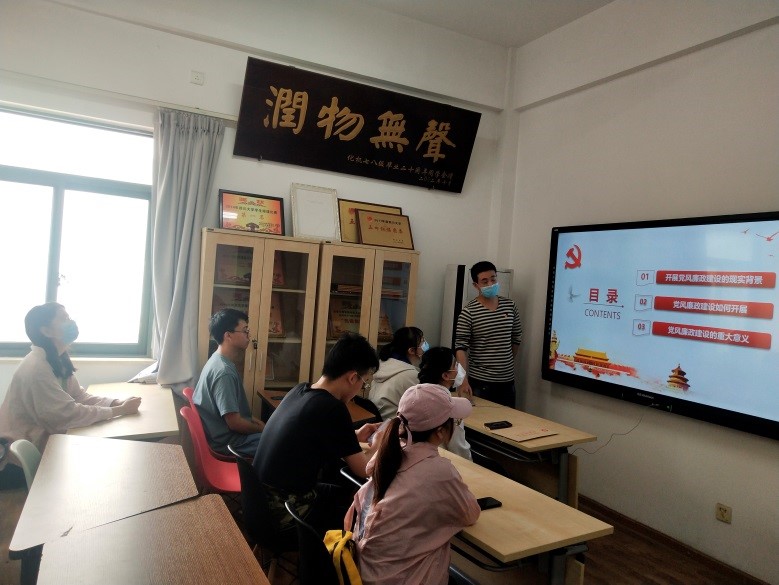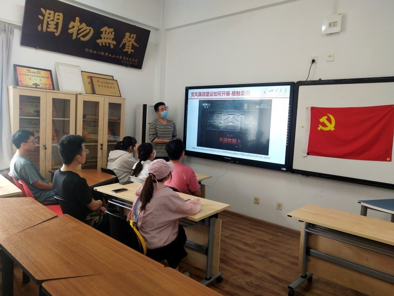江安校区西园三舍活动室开展党风廉政教育宣传月活动。本次活动由支部纪检委员黄天同志主讲“学‘纪法同行’·树新风正气”的专题党课,本科社区党支部共11名成员参与此次活动。