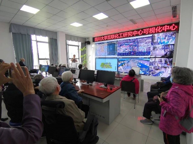 在卓工楼204室,互联化工研究中心的戴一阳老师为各位老教师们进行了一场生动的“可视化教学”:初步了解“互联网+化工”的现代应用方式后,戴一阳老师用化工园区的应用案例操作演示,实时监控反馈园区的安全系统等,将互联手段融入化工生产。同时互联化工的吉旭老师进行了补充交流,介绍互联化工专业更深更广泛的应用及发展前景,加深理解。
