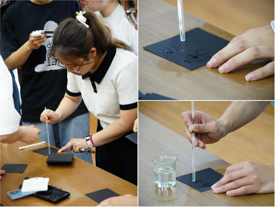 明担当。AV研究所 研究生辅导员邓磊以盐水为喻,带领同学们在黑色卡纸上书写新时代担当承诺,让学生将责任与使命铭记于心。