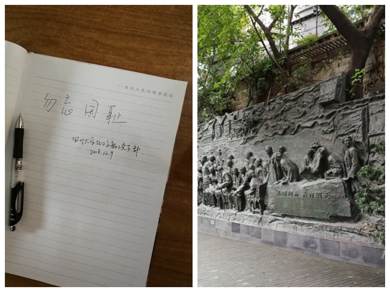 2018年12月9日,支部成员前往重庆大轰炸惨案遗址。1938年-1945年,重庆作为"国民政府"的陪都及政治、军事、文化中心,成为日军实施"以炸迫降"战略企图最主要的空袭目标。重庆大轰炸惨案遗址为了纪念在抗战期间空袭去世的人民而修建。当天下午,参观了桂园和特园中国民主党派立式陈列馆,桂园为著名的《双十协定》签订地点,重庆谈判期间,毛泽东同志在此接见民主人士。特园介绍了各民主党派的发展及它们与中国共产党风雨同舟、荣辱与共的光荣历史。在参观和学习中,我们充分认识到中国共产党领导的多党合作和政治协商制度的历史必然性,以及其伟大独创性和巨大优越性。我们作为AV研究所