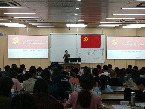 刘肖教授以“中国人有无信仰?”为话题开始授课,讲述了信仰的三个层次(宗教信仰,文化信仰,政治信仰),并引用习近平总书记,新加坡前总理李光耀,李言荣校长等人的言语,阐述坚定理想信念的重要性。其中以习近平总书记所说的“理想信念就是共产党人精神上的‘钙’,没有理想信念,理想信念不坚定,精神上就会‘缺钙’,就会得软骨病”最为震撼。在课堂上,刘老师紧贴时代,以中美贸易战为例讲解身份认同与行为的关系,以邓小平爷爷为例解释“跟着党走,是对革命理想与信念的坚定追求,坚信正义事业必然胜利”,以法国“黄背心”运动为例,讲述中国共产党与其他国家党派的不同(中华人民共和国是由中国共产党建立的,而其他国家不是)。“教者,效也,上为之,下效之”。刘肖教授指出,广大党员干部是团结带领人民群众落实党的方针政策路线、创造幸福美满生活的谋划者、组织者、实践者,是保障党和人民事业兴旺发达的“关键少数”。中国共产党员的信念是什么?刘肖教授以中国发展道路探索的三个阶段(以西为师,以俄为师,走自己的路)开始,以幽默风趣的语言讲述中国先进分子学习西方的心路历程、十月革命、马克思主义的选择与社会主义制度的建立等。同时,刘肖教授以苏东剧变的历史教训为例,表明“西化”不可取,点明坚定马克思主义领导地位的重要性。最后,刘肖教授以某大学学生入寺体验佛教生活,白恩培受贿案,老人摔倒扶不扶等为例,讲述未来我们如何成为一名合格的共产党人。