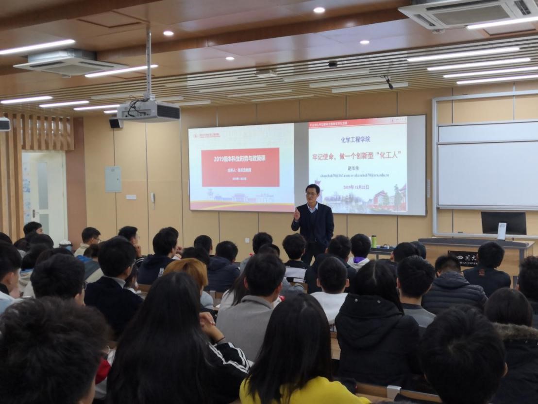 的发展历史和专业情况做了细致的介绍,让同学们了解了学院的“前世与今生”“历史与使命”。接着,赵院长还对学院的本科专业进行了细致的介绍,让同学们了解了各个专业的培养目标和学院本硕博贯通式的培养体系。赵院长最后强调,化工专业是国家发展生产的基础,新材料、新工艺、信息和计算机,都离不开化工。我们新一代“化工人”应该对化工的前景充满信心,只有学习好这一重点学科才能在近年大热的跨学科尝试中获得突破。
