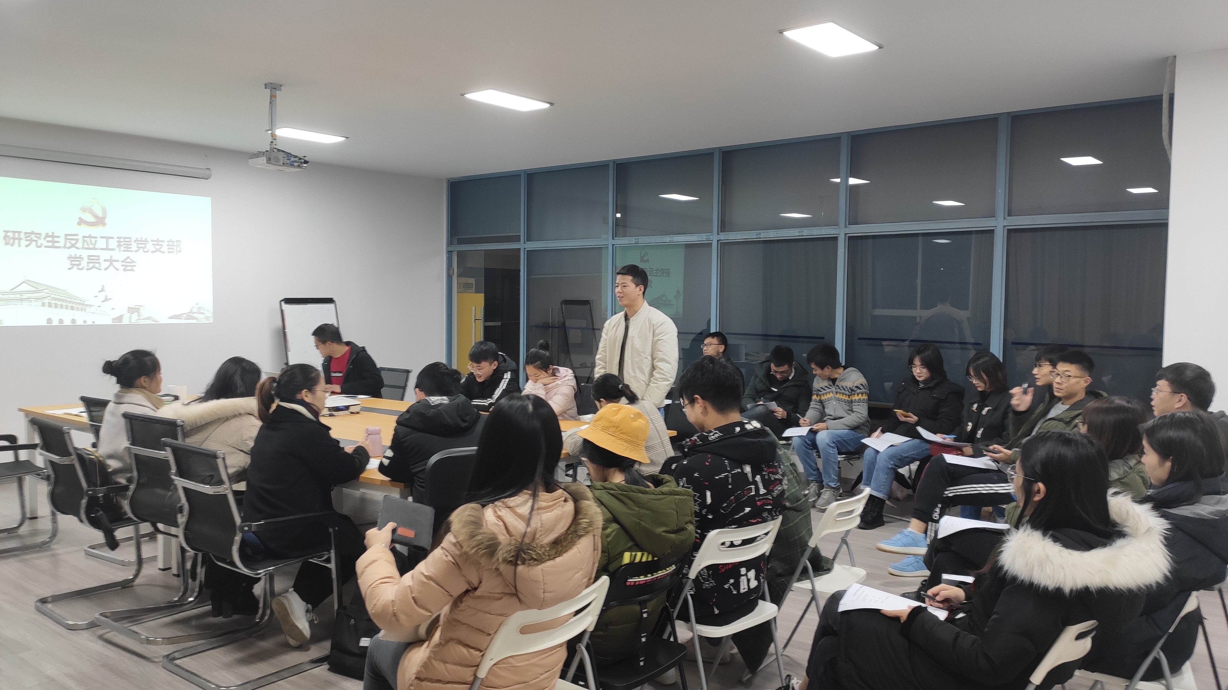 研究生反应工程党支部于2019年12月4日在第一实验楼B501会议室召开关于发展贺华强同志为预备党员的党员大会。此次会议由研究生反应工程党支部书记谢辉同志主持,支部党员、预备党员共同参与。