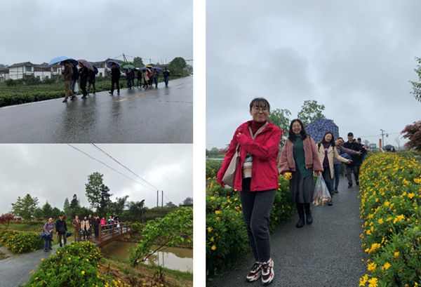 淅淅小雨中老师们乘车到达明月村,先进行了集中学习,随后沿着明月村内的环形大道游览了村内的茶园竹林和果园,雨水后春芽萌动,一排排茶树上有了一抹新绿,雷竹笋子也是最妙的舌尖春色。