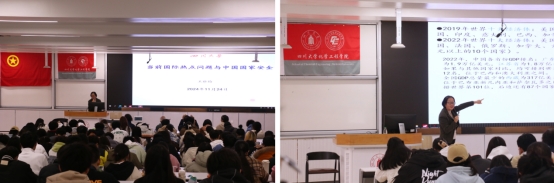 王雅梅老师展开了题为“当前国际热点问题与国家安全”的专题讲授。王雅梅老师首先阐述了国家安全与“百年未有之大变局”的紧密联系,指出随着世界百年未有之大变局的加速演进,世界政治格局也发生变化,而世界亦步入新的动荡变革期,我国面临复杂严峻的外部安全形势。