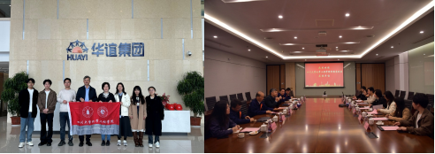 实践团成员在华谊基地合影(左)及在华谊进行座谈交流(右) |