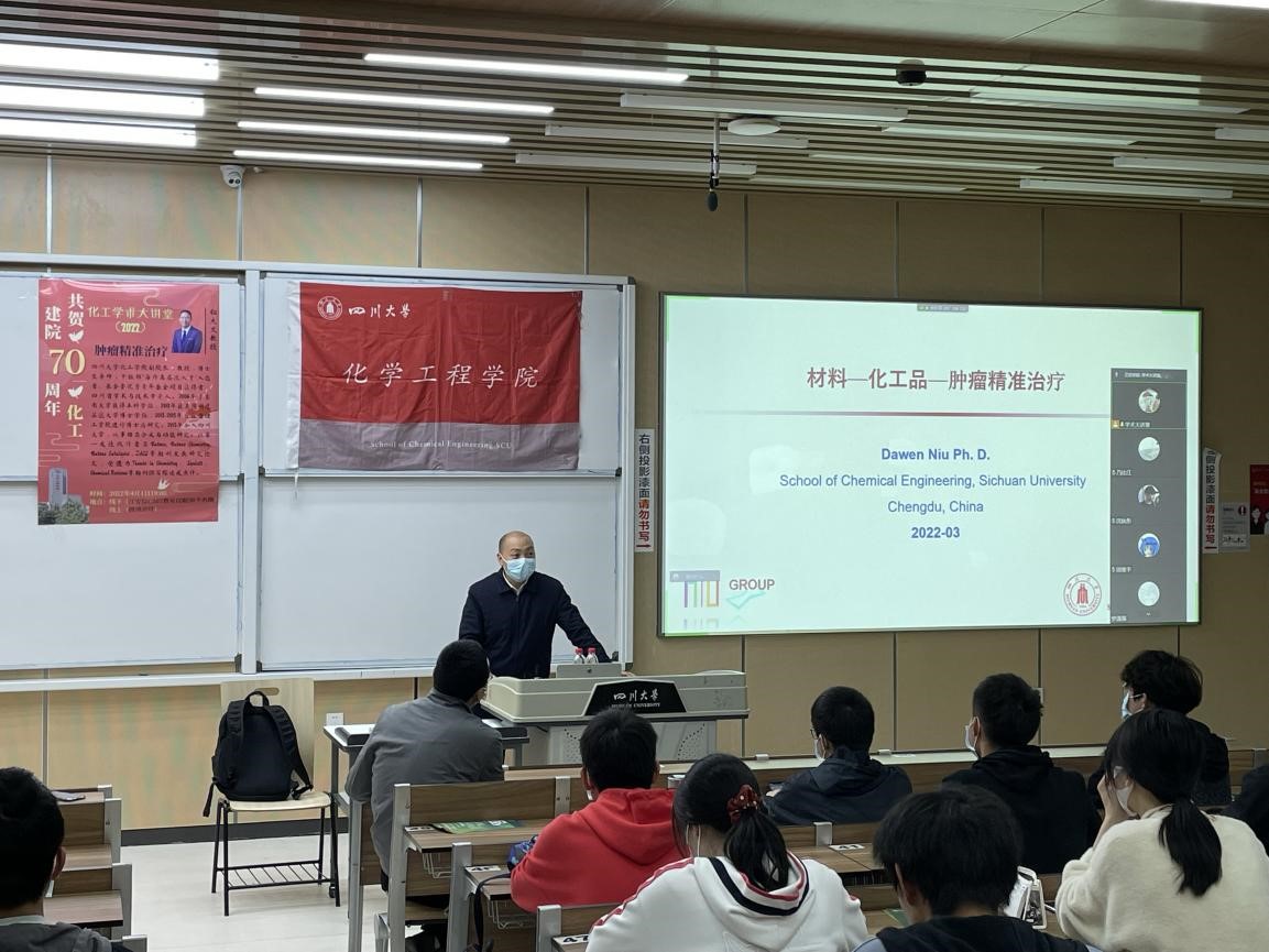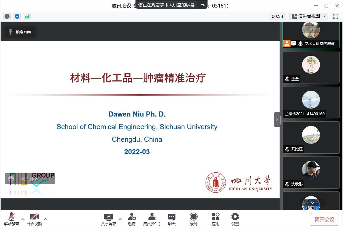 江安校区综合楼C座C507顺利开展。为了做好疫情防控工作,本次讲座采用线下交流和线上会议直播的形式,50人线下参与讲座,其余同学参与线上腾讯会议。主讲人钮大文教授为同学们带来了主题为“材料-化工品-肿瘤精准治疗”的精彩讲座,此外本次讲座还邀请了AV研究所