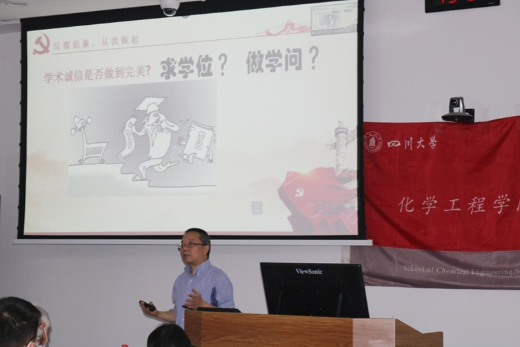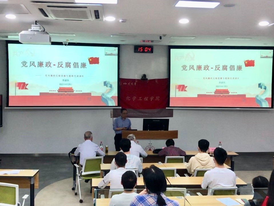 为进一步宣传党风建设,加强支部党员的廉政思想,研究生第一党支部、研究生磷化工党支部、研究生分离科学党支部于2022年4月29日望江校区基础教学楼C102组织学习了唐盛伟副院长主讲的“党风廉政-反腐倡廉”党课。遵循学校疫情防控要求,本次党课线上线下同时进行,30余名党员线下参加本次活动,支部其他党员线上观看。