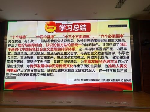 本次会议由党支部书记王坡同志主持。会议前,支部全体党员已在网络、报刊等平台上对党的二十大精神进行学习。在会议中,党员同志们积极参与,夏有强同志向党支部成员们详细讲解了习近平新时代中国特色社会主义思想的主要内容,支部同志们自觉进行了重点知识记录。习近平新时代中国特色社会主义思想的主要内容概括为“十个明确”、“十四个坚持”和“十三个方面成就”,在这其中,“十个明确”概括了习近平新时代中国特色社会主义思想核心内容,“十四个坚持”构成新时代坚持和发展中国特色社会主义的基本方略,“十三个方面成就”总结了新时代历史性成就和历史性变革,这些内容必须长期坚持并不断丰富发展。