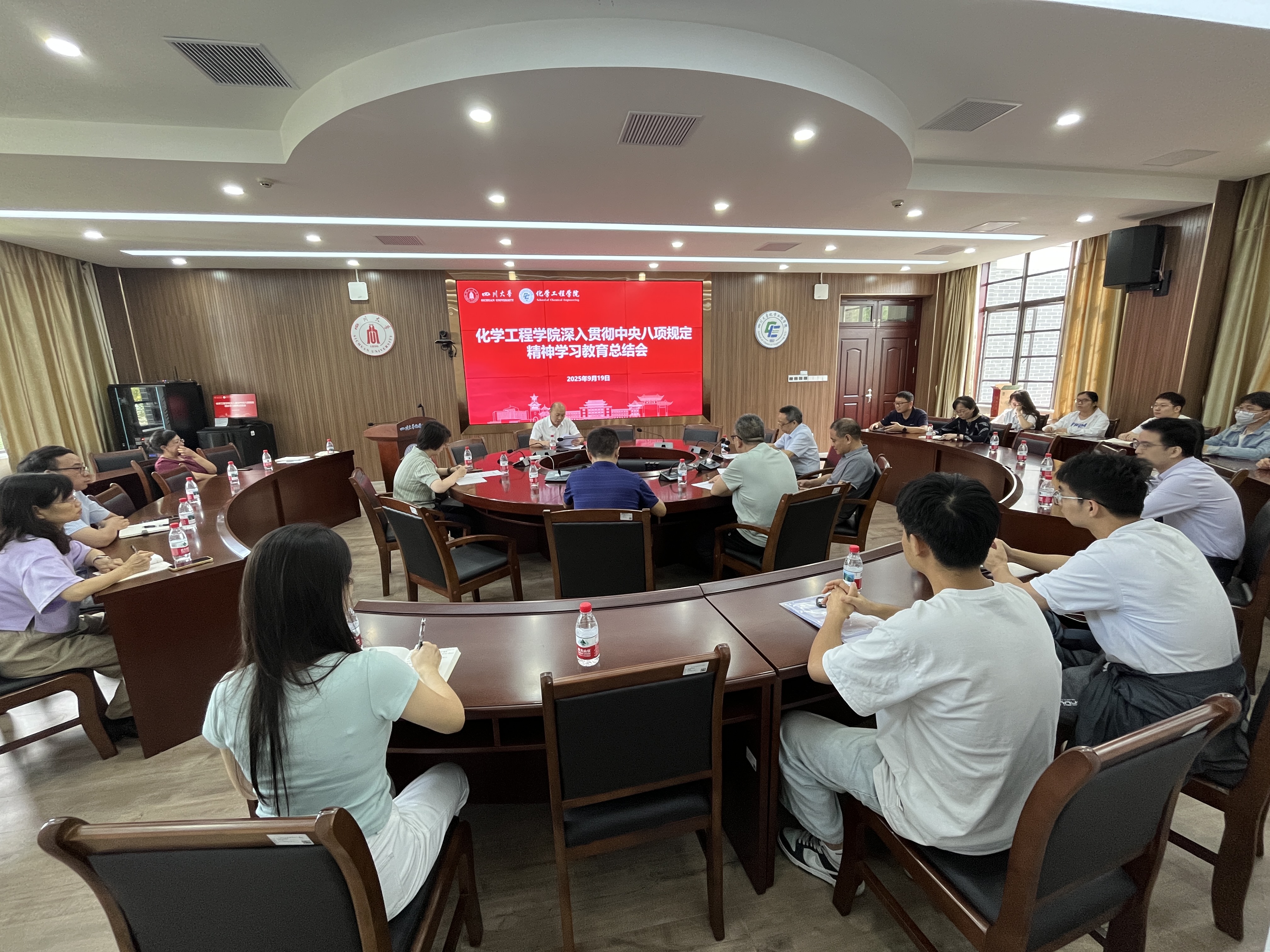 在望江校区化工楼312会议室召开深入贯彻中央八项规定精神学习教育总结会。学院党政领导、“两委”委员、专职组织员和全体支部书记代表等参加会议。学院党委副书记姜利寒主持会议。